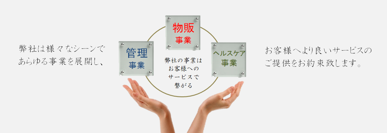 弊社における主な事業「物販事業」「管理事業」「ヘルスケア事業」